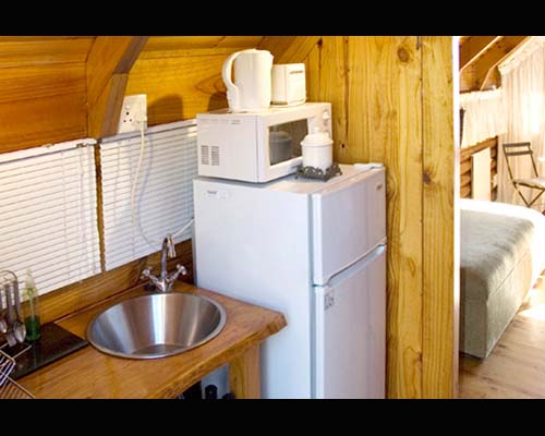 Mini Kitchen consisting of gas cooker, cutlery, crockery, wash-up area, fridge-freezer, microwave, kettle, toaster