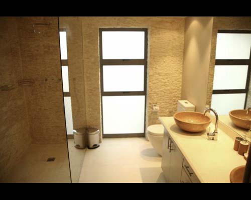 Each bathroom combines functionality with amazing comfort and style, a perfect place to relax and unwind. The large and polished vanity areas have self-standing, earth-colour stone bowl basins and fitted cupboards beneath with useful drawers. The loos have hidden cisterns and the glass showers are open with light stone tiles.