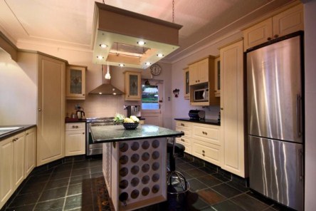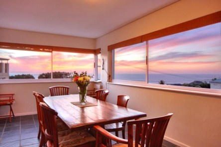 Adjoining the living room is the dining area with large 8 seater sleeper wood dining room table. The eclectic style of the living room is drawn into the dining room by well selected mismatched chairs, from which to enjoy almost panoramic views of the mountains and coast line.