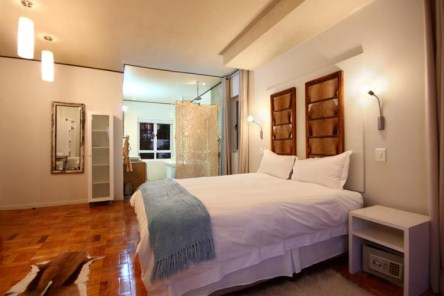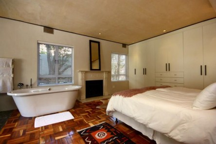 Bedroom two has Atlantic sea and Table Mountain views, and open plan bathroom with shower and free standing bath. There is a king size bed, comprised of two singles, air-conditioning and modern flat screen TV.