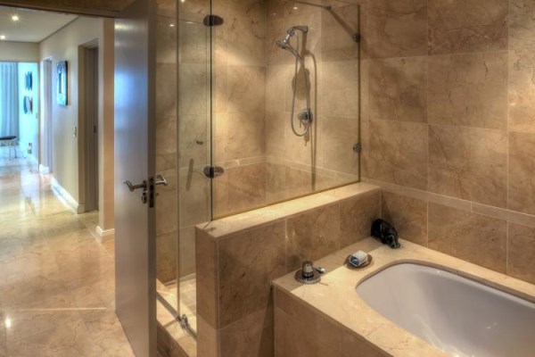 Creamy marble, shimmering chrome and plate glass decorate both bathrooms, with shower, bath, basin and toilet and a stylish guest bathroom is situated off the living area.