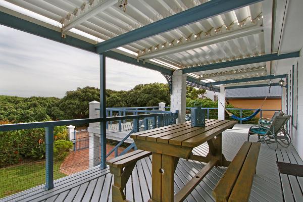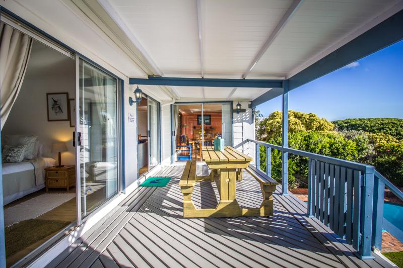 Large upstairs wooden sunbathing deck with mountain and sea views