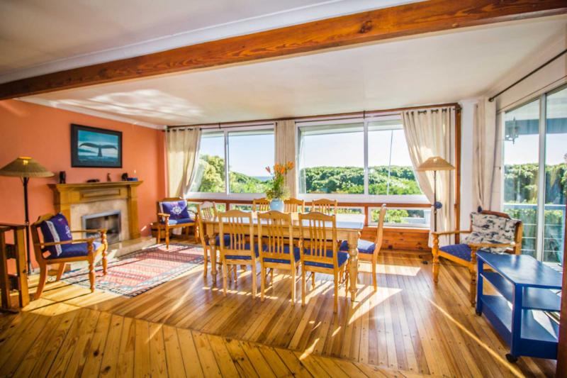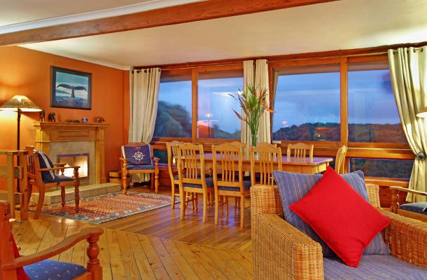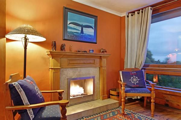 Open plan upstairs lounge boasting sea views, indoor fireplace, dstv, dvd and hi fi system leading to open plan dining room