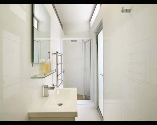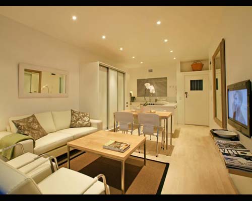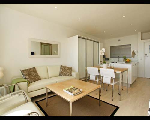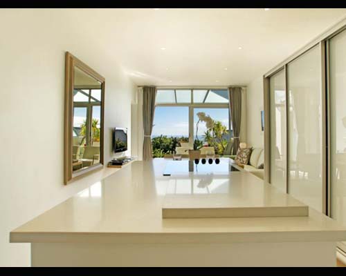 White on white tones carried throughout the entire apartment compliment natural tones of grey and beige in scatter cushions and stylishly placed accessories.
