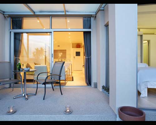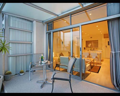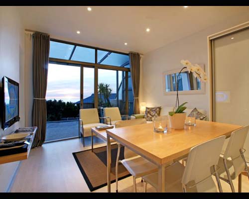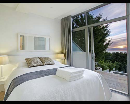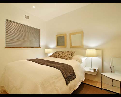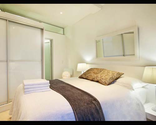 The bedrooms are neat, with plush linen and bright scatter cushions. Built-in cupboards are finished off with modern, opaque glass sliding doors. This theme is carried out through all storage units in the apartment. Large mirrors are cleverly placed to give a greater sense of space.