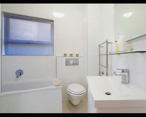 The master bedroom opens up directly onto the garden. The en-suite bathroom runs along the length of the room, behind the built-in cupboards. A spacious shower, modern fittings and a heated towel rail give this bathroom a neat and stylish finish.