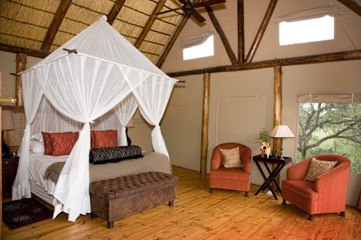 Discreetly positioned in the bush at the top end of an open valley in the reserve, each of the superlative en-suite, tented and thatched suites overlooks a watering point with big sky views.