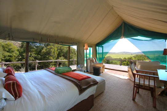 The main lodge and three luxury tented chalets are elevated on expansive wooden decks that command panoramic views of the open plains.
