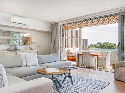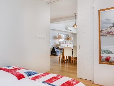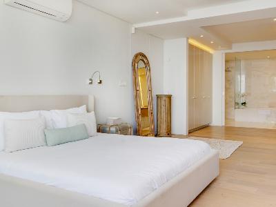 The main bedroom has a Queen-size bed, walk in dressing room and views of the ocean. The second bedroom has twin beds and ample cupboard space.